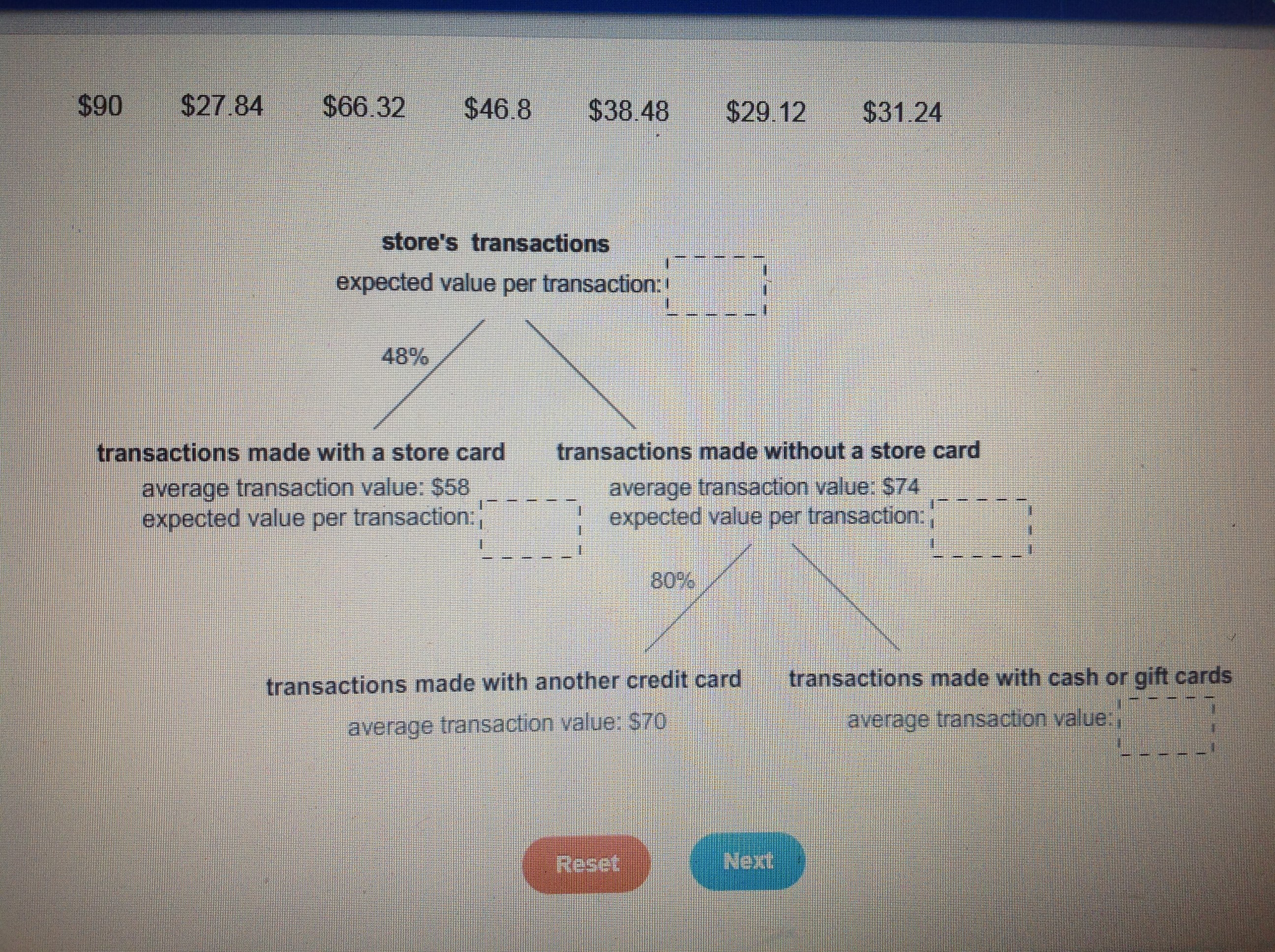 The expected value of <em>store card</em> transactions will be the product of their average value ($58) and their probability of occurrence (48%).