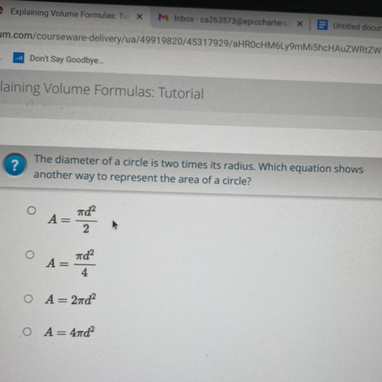 . Since the answer choices are in terms of <em>d</em>, the diameter of the circle, you will need to find <em>r</em> in terms of <em>d</em>.