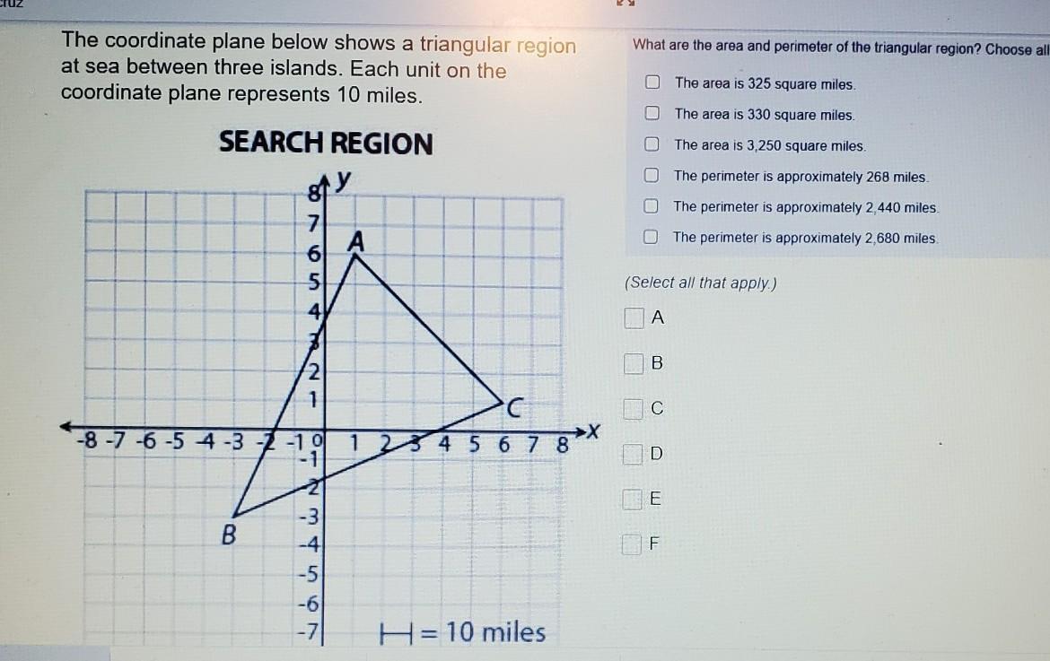 es. what are the area and perimeter of the triangular region? choose all that are correct​