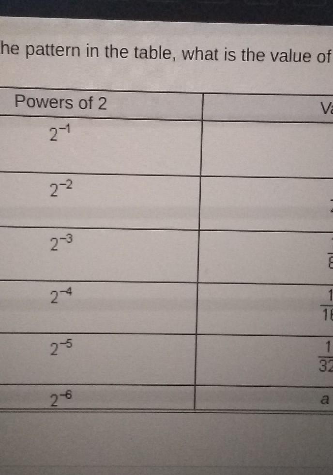 Based on the pattern in the table, what is the value of a? Powers of 2 Value 1 2 2-1 2-2 1 4 23 1 8 2-4 1 16 1 32 a 2-6 -R4 Save