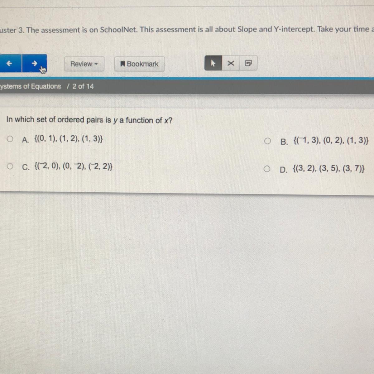 Ex: The set {(3 , 5) , (-2 , 1) , (4 , 3)} represents y as a function of x because x = 3 has only y = 5, x = -2 has only y = 1, x = 4 has only y = 3