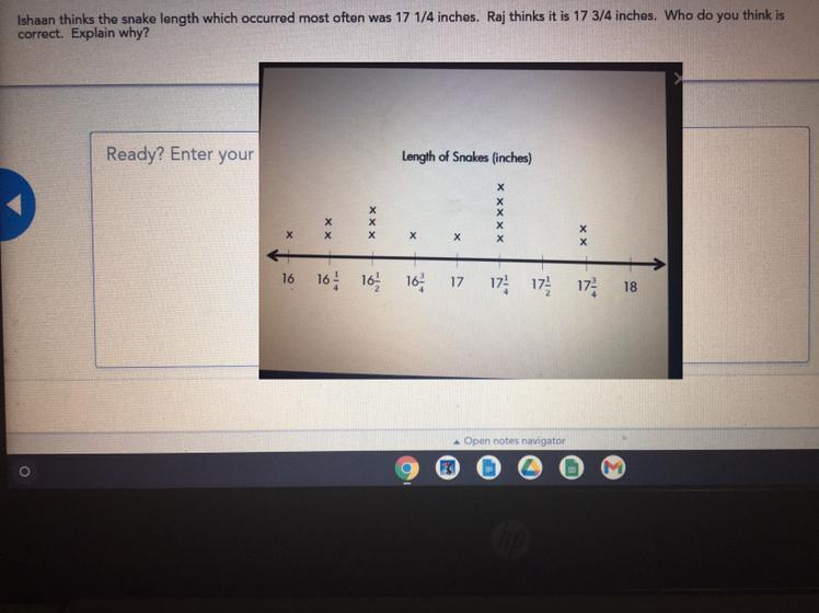 Ishaan is correct because snakes with 17 1/4 inches occured most often  in the dot plot. Raj is incorrect because 17 3/4 didnt occur the most often but it was the highest length of the snake. Ishaan is correct.