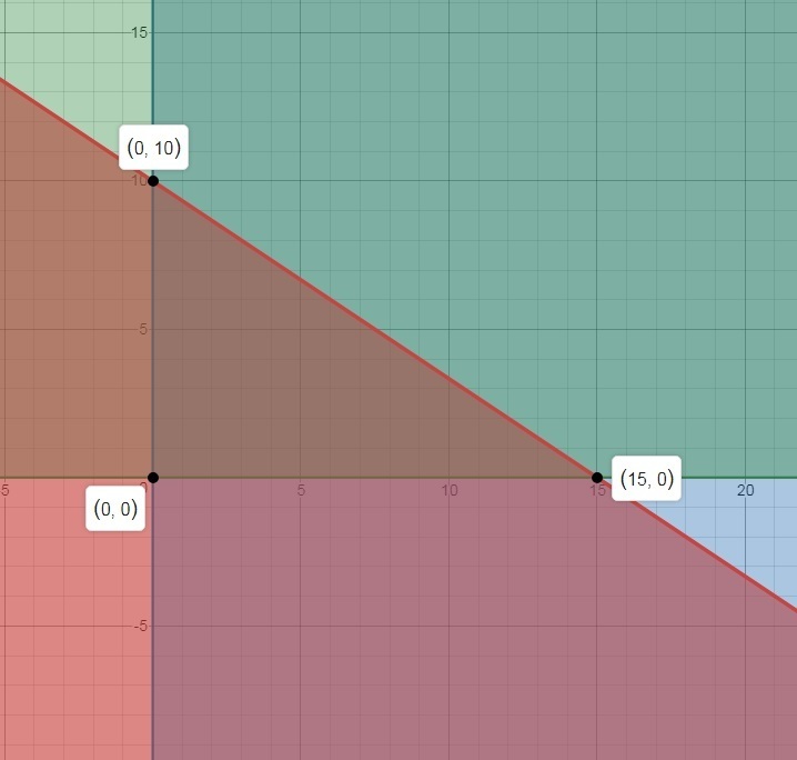 Answer: Line joining ordered pairs (0, 10) and (15, 0) and Shade the portion of the graph below this line which lies within the first quadrant.