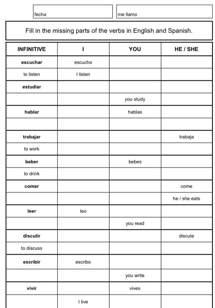 escuchas, escucha, listen, listens, estudio, estudias, estudia, to study, i study, he studies, hablo, habla, to talk, talk, talk, talks, trabajo, trabajas, work, work, works, bebo, bebe, drink, drink, drinks, como, comes, to eat, i eat, you eat, lees, lee, to read, i read, he reads, discuto, discutes, i discuss, you discuss, he discusses, escribes, escribe, to write, i write, he writes, vivo, vive, to live, you live, he lives