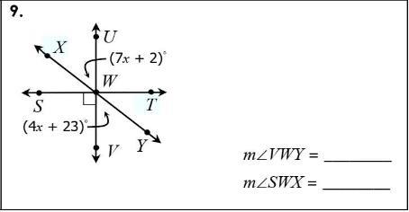 we are given ∠XWU=(7x+2)° and ∠VWY=(4x+23)°, so: