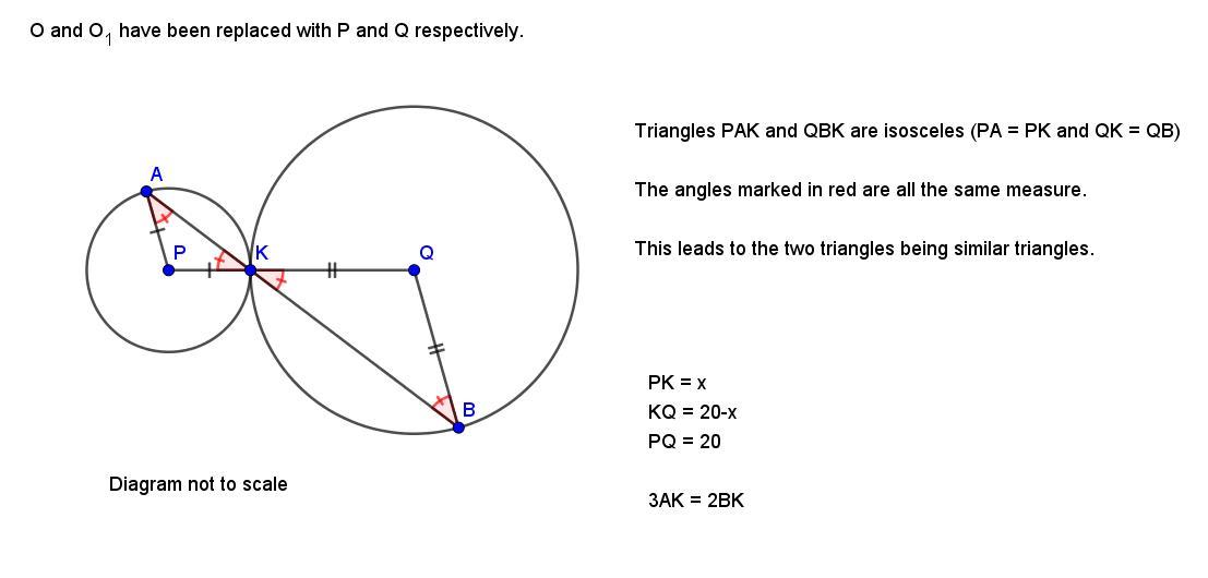 The segments PA and PK are radii of the smaller circle, so PA = PK which leads to triangle PAK being isosceles. Triangle QBK is also isosceles for similar reasoning.
