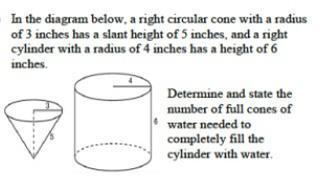 a radius of 4 inches has a height of 6 inches. Determine and state the number of full cones of water needed to completely fill the cylinder with water.