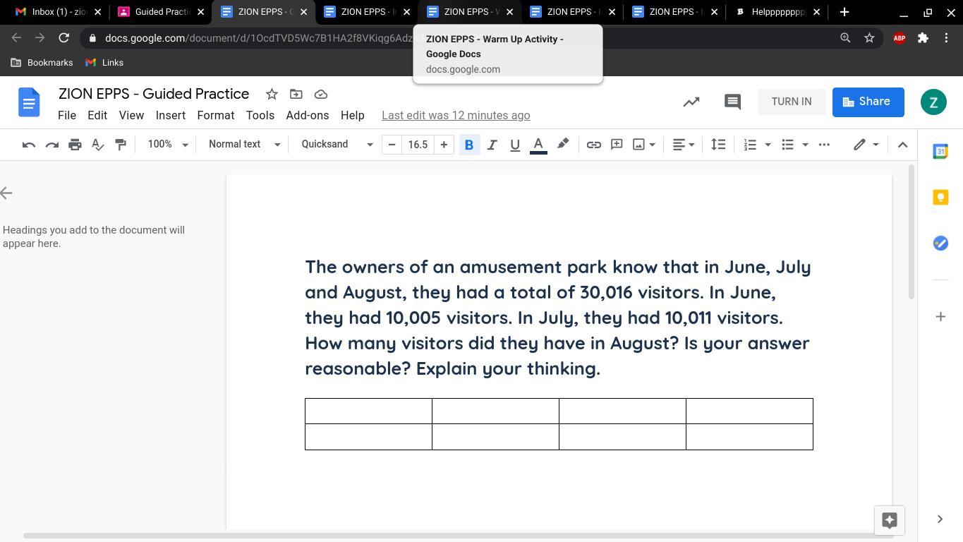 They had 10,000 in August because they had 30,016 visitors with all 3 months combined so if they had 10,005 visitors in June and 10,011 visitors in July you add 10,005 + 10,011 which is 20,016 and to find the visitors in August you subtract 30,016 - 20,016 which gives you 10,000 so they had 10,000 visitors in August