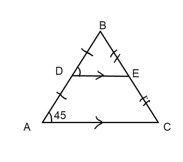 m∠BDE when m∠BAC = 45° and points D and E are the midpoints of AB and BC, respectively, in ΔABC