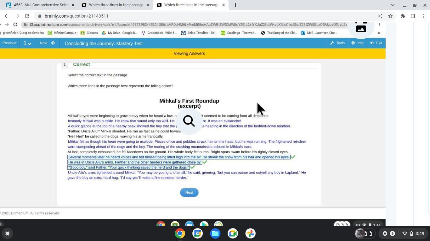 Answer: it IS "He was in Uncle Ailu's arms. Farther and the other herders were gathered close by." and "'Good boy,' said Father. 'Your quick thinking saved the herd and the dogs.'" and "Several moments later he heard voices and felt himself being lifted high into the air. He shook the snow from his hair and opened his eyes."