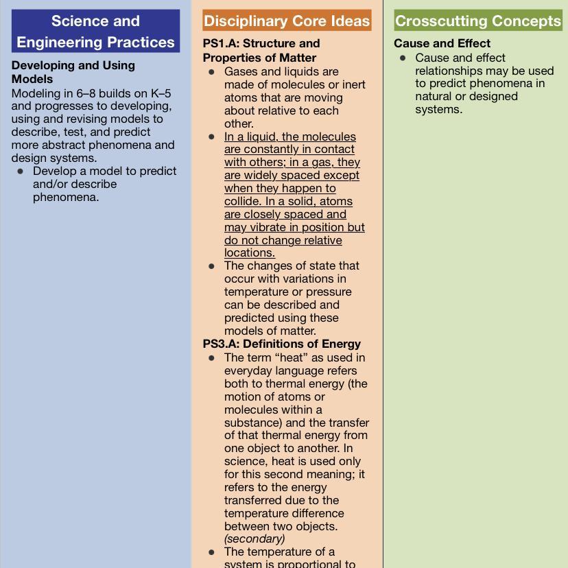 [Clarification Statement: Emphasis is on qualitative molecular-level models of solids, liquids, and gases to show that adding or removing thermal energy increases or decreases kinetic energy of the particles until a change of state occurs. Examples of models could include drawing and diagrams. Examples of particles could include molecules or inert atoms. Examples of pure substances could include water, carbon dioxide, and helium.]