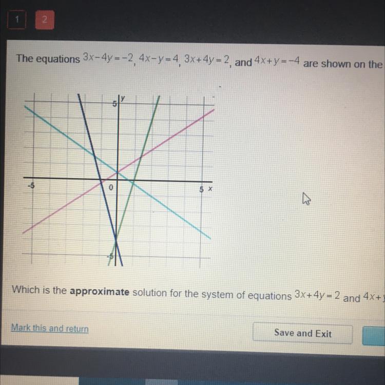 The equations 3x-4y=-2 4x-y=4, 3x+4y = 3, and 4x+y=-4 are shown on the graph below.