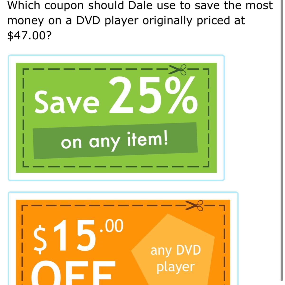 Dale should use the $15 dollars off coupon to save the most money which costs 47.00.