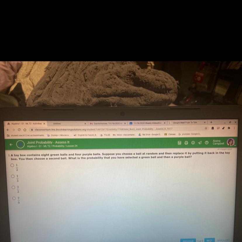 You multiply the probability of the green ball which is 8/12 by the probability of the purple ball which is 4/12 and you get 0.222 which is also 2/9.
