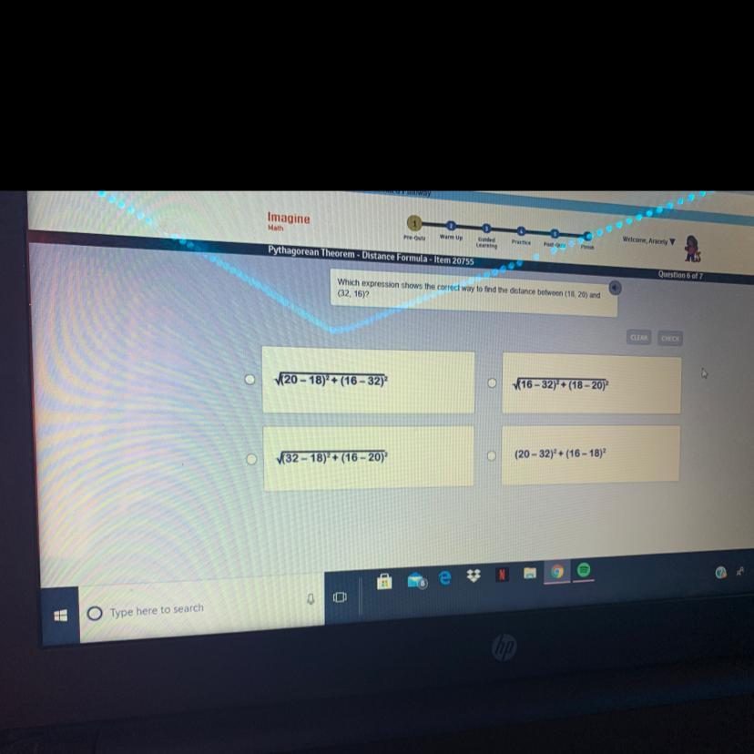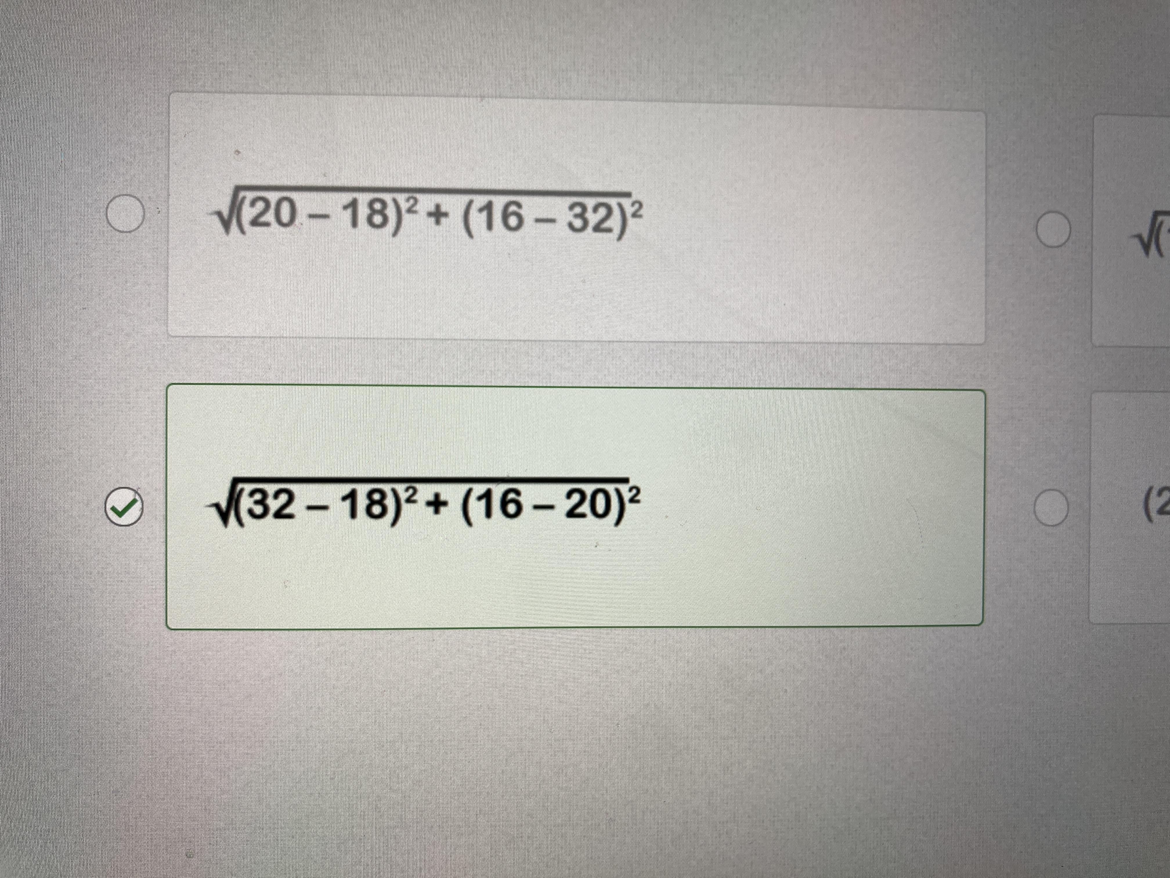 Which expression shows the correct way to find the distance between (18,20) and (32, 16)