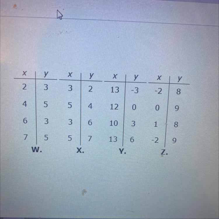 Form the tables given, in table W, every x-value (input) has exactly one y-value (output) that is related to it.