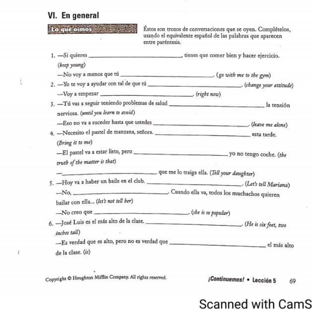 Answer 1. -mantenerte joven -vayas conmigo al gimnasio 2.- cambia tu actitud - ahora or ahora mismo 3.-hasta que aprendas a evitar -déjame solo or en pas 4.-tráemelo -la verdad es 5.-decirle a Mariana -no le digamos 6.-él mide seis pies y dos pulgadas de alto