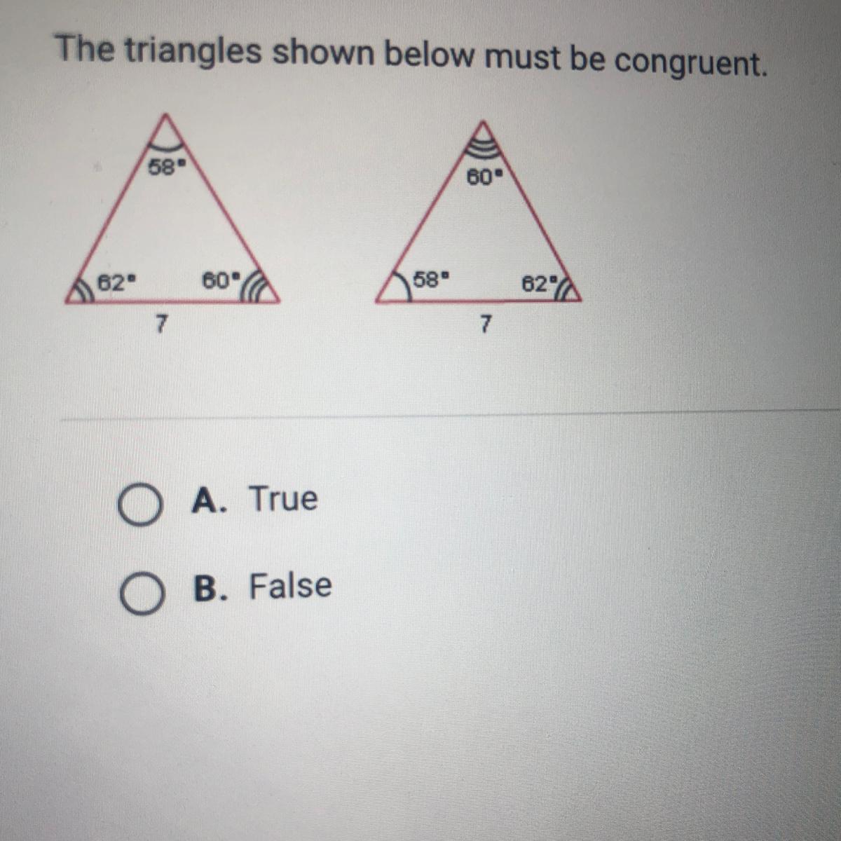 with this information we can determine that the triangles are not congruent therefore the answer is B. False