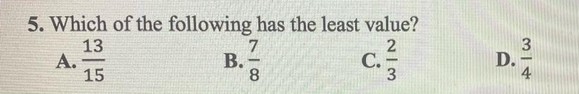 Now, it is easier to see which fraction has the least value (or the one that is the smallest. Your answer is 2/3, since 80/120 is the smallest out of the four.