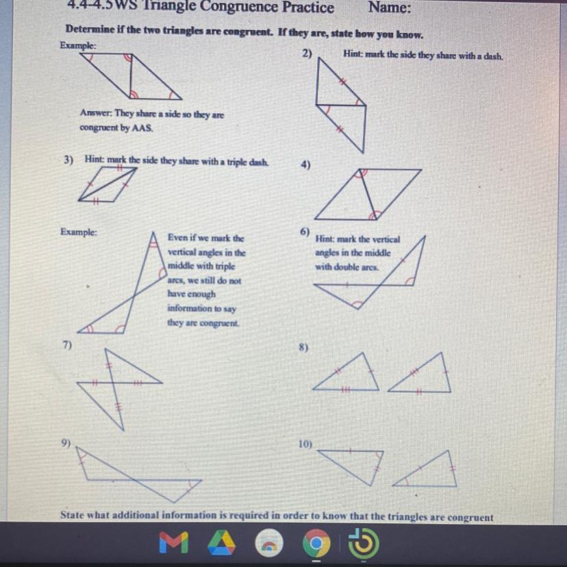 The unmarked vertical angles can get double arcs to show they are congruent. We have a pair of congruent sides that are not between the two pairs of congruent angles, so we go for AAS (problems 1 and 6 also use AAS).