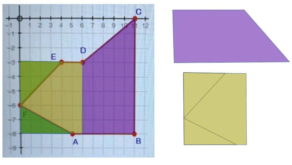 now, the yellow rectangle, is a 6x5, and it has those two green triangles in it, well, if we simply get the area of the rectangle, 30 anyway, and subtract the areas of those green triangles, what's leftover, is the rest of the shape on points DEFA.