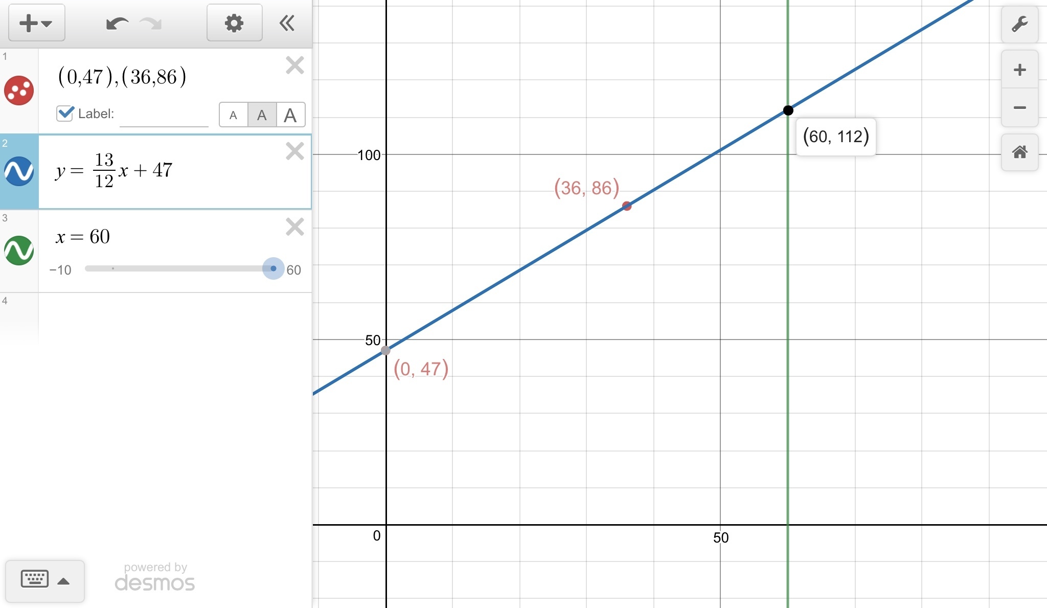 Points (0, 47) and (36, 86) can be placed on the graph and a line drawn through them. That line will have slope (86-47)/(36-0) = 39/36 = 13/12.
