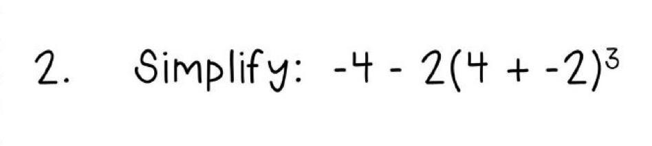 -4 - 2(4 + (-2) )³ = -4 - 2(4 - 2)³