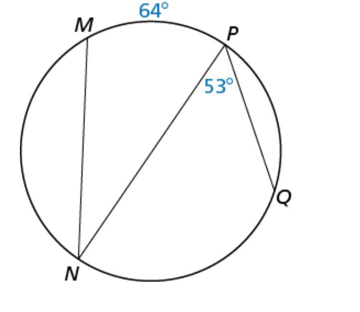 An inscribed angle is an angle with its vertex on the circle, formed by two intersecting chords. Angle N perfectly fits this description. An inscribed angle is equal to 1/2 of its intercepted arc (the arc opposite the angle). The arc opposite angle N is equal to 64 degrees, so angle N is equal to 1/2 of that, or 32 degrees