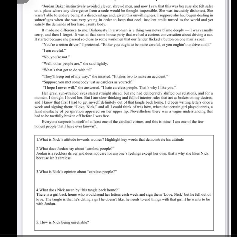 So this is an excerpt from The Great Gatsby by F. Scott Fitzgerald. In the text, the scene of Jordan Baker and Nick Carraway driving in her car and their conversation deeply reveals the theme of this novel- which is the careless of the Elite. When it comes to carelessness, you can't get more reckless than Tom and Daisy Buchanan. The super-rich heirs of old families, Tom and Daisy were born into the lap of luxury, and their greatest purpose in life is to remain there, no matter the cost to others. The carelessness exemplified by Tom and Daisy Buchanan is a carelessness of the elite, the brutal and thoughtless power that the 'haves' of this world can exert, most particularly on the 'have-nots.' From Nick's perspective of "careless people", he shows abomination and disrelish. Though Nick has feelings for Jordan Baker, however, deep down, the "Elites'"ignorance towards society is the real reson that spiritually separates Nick with them.