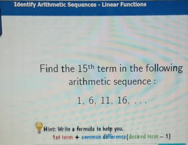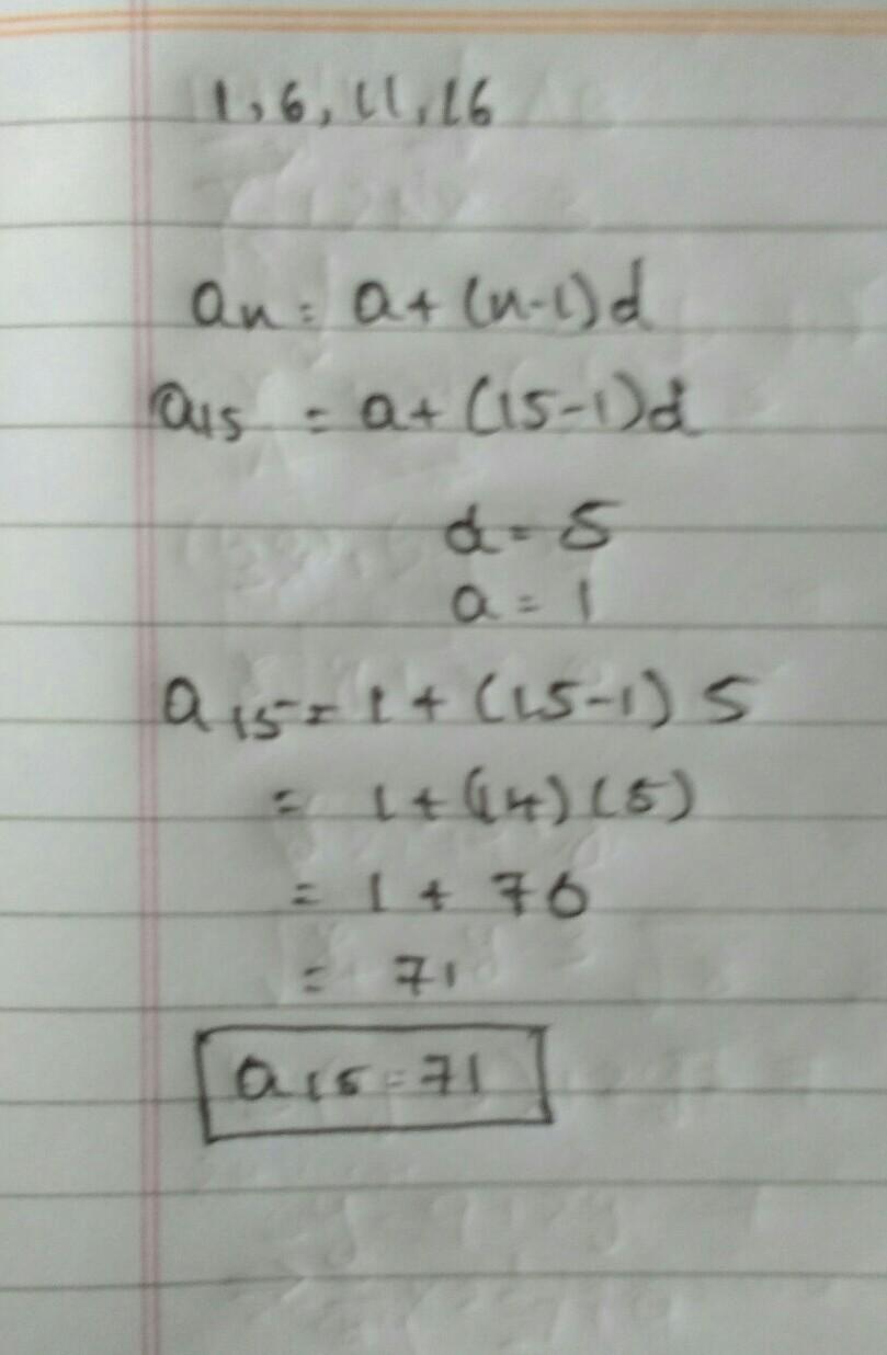 a₁₅ = 1 + (14 × 5) = 1 + 70 = 71
