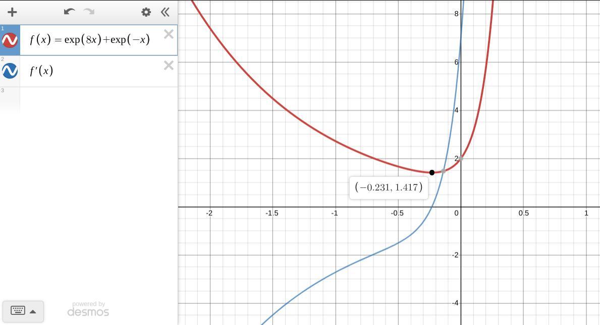 The first derivative of f(x) = e^(8x) +e^(-x) is ...