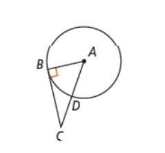 A circle has center A. Points B and D are on the circle, with B on the left and D near the bottom. Point C lies outside the circle such that the line segment A C passes through point D and the line segments A B and B C form a right angle.