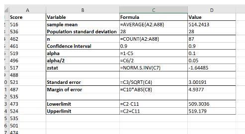 The average score of a random sample of 87 senior business majors at a university who took a certain standardized test follows a normal distribution with a standard deviation of 28. Use Excel to determine a 90% confidence interval for the mean of the population. Round your answers to two decimal places and use ascending order.