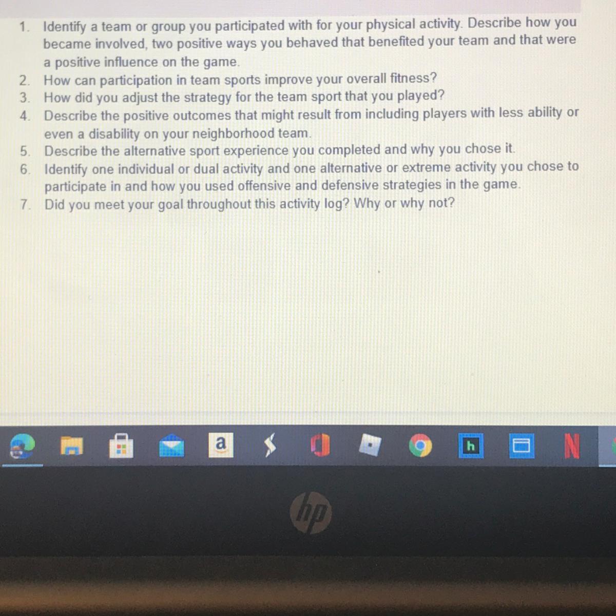 1.) Identify a team or group you participated with for your physical activity. Describe how you became involved, two positive ways you behaved that benefited your team and that were a positive influence on the game.
