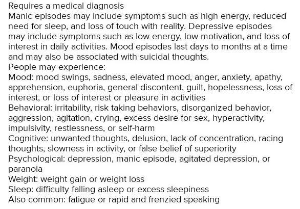 Requires a medical diagnosis Manic episodes may include symptoms such as high energy, reduced need for sleep, and loss of touch with reality. Depressive episodes may include symptoms such as low energy, low motivation, and loss of interest in daily activities. Mood episodes last days to months at a time and may also be associated with suicidal thoughts. People may experience: Mood: mood swings, sadness, elevated mood, anger, anxiety, apathy, apprehension, euphoria, general discontent, guilt, hopelessness, loss of interest, or loss of interest or pleasure in activities Behavioral: irritability, risk taking behaviors, disorganized behavior, aggression, agitation, crying, excess desire for sex, hyperactivity, impulsivity, restlessness, or self-harm Cognitive: unwanted thoughts, delusion, lack of concentration, racing thoughts, slowness in activity, or false belief of superiority Psychological: depression, manic episode, agitated depression, or paranoia Weight: weight gain or weight loss Sleep: difficulty falling asleep or excess sleepiness Also common: fatigue or rapid and frenzied speaking