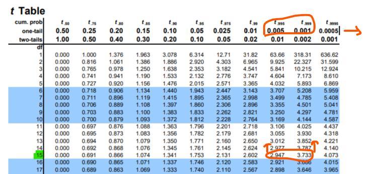 The tabulated value = 2.60 at 0.01 level of significance with '15' degrees of freedom