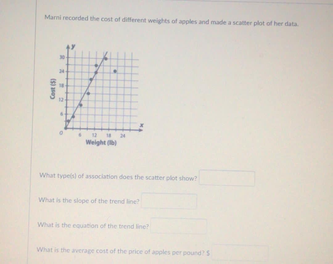 Type of association, slope, equation of trend line and average cost of apple per pound.