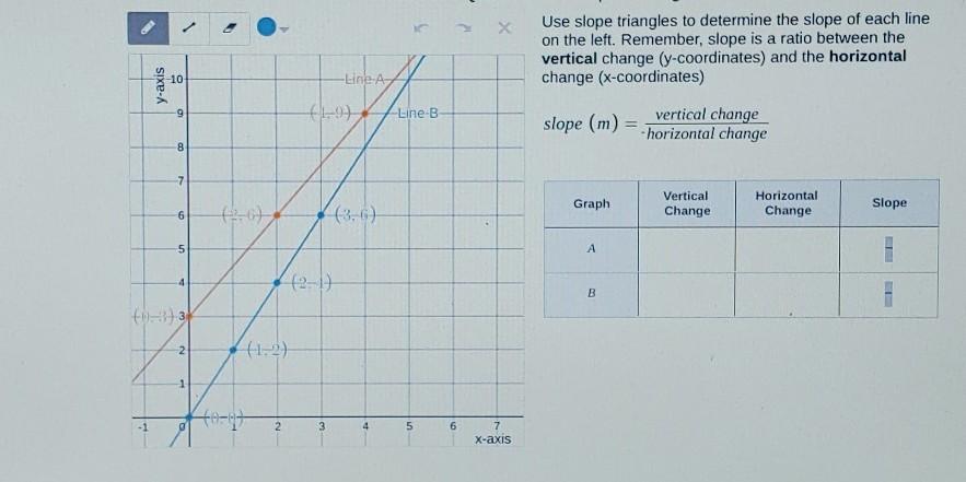 We create the triangles they request for each line, as shown in the attached image, which we use to calculate the vertical change (height of the triangle) and horizontal change (base of the triangle). The height and base of the triangles (depicted in red and blue matching the color of the lines) have been highlighted for easy identification.