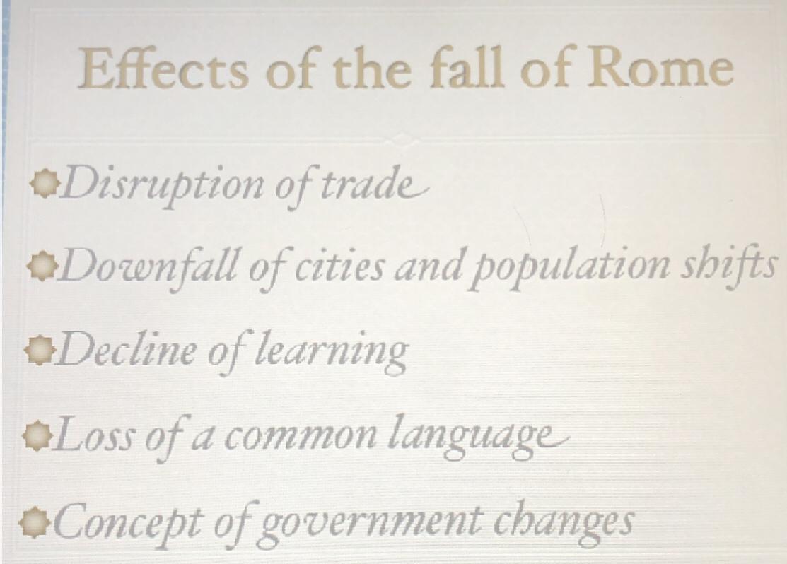 In my opinion, the disruption of trade is most likely the MOST severe effect that resulted in the fall of Rome. Trade has always been vital because every country has something special to offer weather it be oil, wool, wine, and a wide variety of food. Being able to trade with countries like Spain, France, North Africa, and the Middle East provided them a wide range of objects such as wool, tin, and lead. If their trade was disrupted, they empire would crumble at a fast rate due to a lack of supplies that were once vital. There would be less money coming through, and chaos would reign.