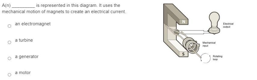 A(n) _________ is represented in this diagram. It uses the mechanical motion of magnets to create an electrical current.