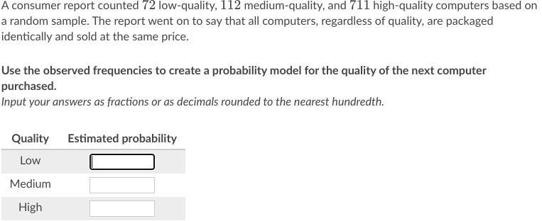 - You have to find the total number of computers to find the denominator: 72 + 112 + 711 = 895.