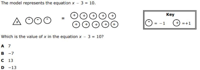 The model represents the equation - 3 =10. Which is the value of x in the equation x - 3 = 10?