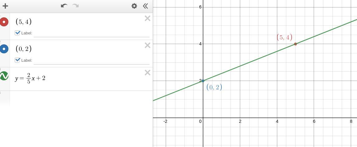 The slope of this line is 2/5. Next, you can use that slope and whichever known point you want to find the y-intercept. Slope-intercept form is: