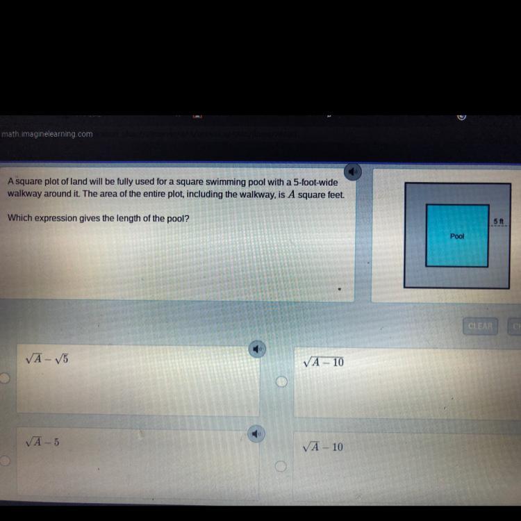 ∴ The expression that gives the length of the pool is \sqrt{A} - 5