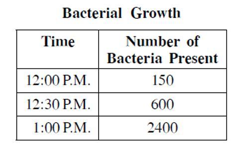 nutes beginning at 12 PM. The table shows Judy's data. If the patten of bacterial growth remains constant, how many bacteria should be present in the culture dish at 2:00 PM?