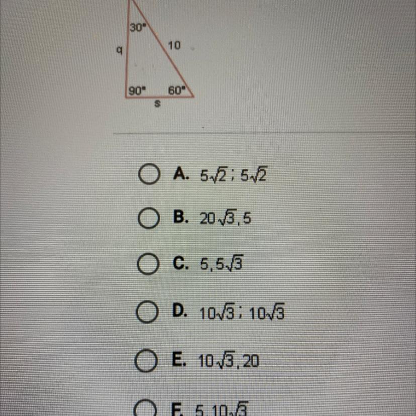 The formula for the side length across from the 60 degree angle is x√3, and again, if x = 5, side q = 5√3 which is choice C.