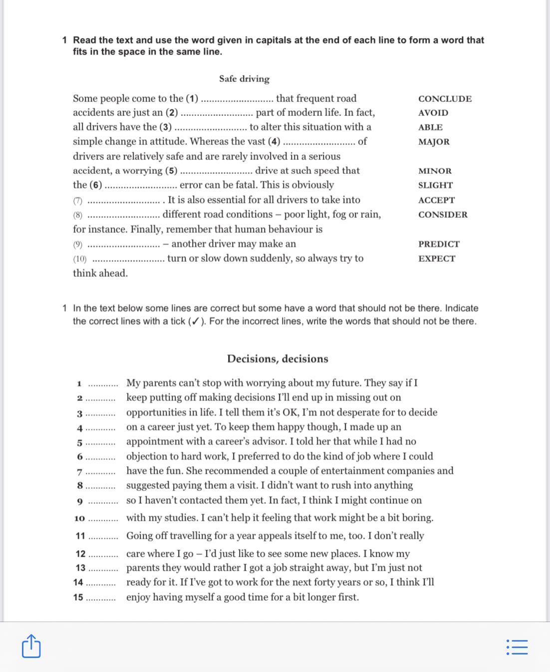 In the other part of the excerpt on <em>decisions, decisions, </em>the correct lines were marked while the words that do not fit into each sentence line were identified.