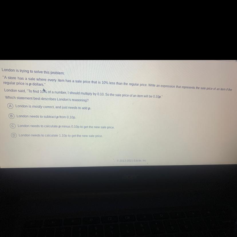 For example, say that the regular price was $2. 0.10 x 2 = 0.20. Using the info in option c, then she would subtract 0.20 from 2, which would give her the sale price. Hope this helps!