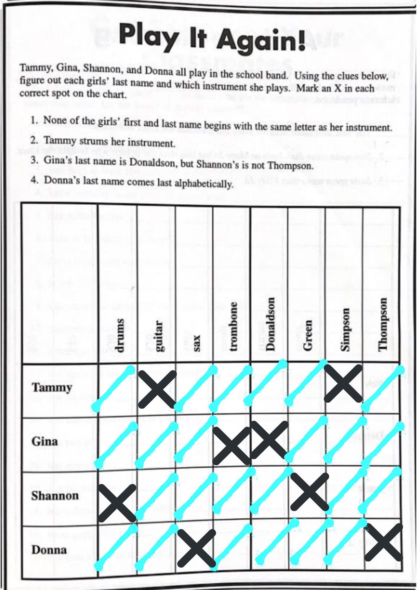 This is called an X logic puzzle. You use the clues to figure out the answers and in this particular case, you are trying to figure out the girls' first and last names and the instrument they play.