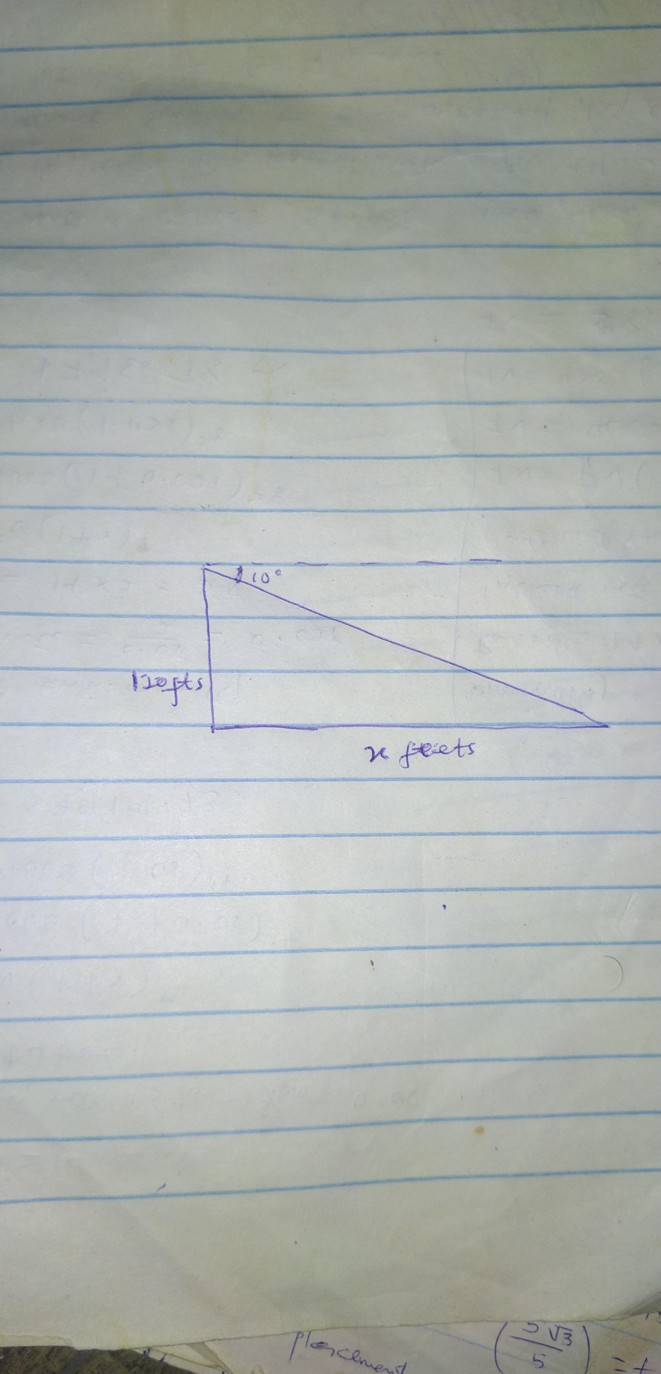 The angle of depression of a buoy from a point on a lighthouse 120 feet above the water's surface is 10 degrees. Find the distan